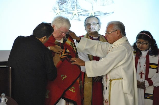 Mississauga, Ont.—A hush fell in the room as aboriginal bishops, clergy and elders wrapped a sunset red Pendleton blanket over Archbishop Michael Peers, former primate of the Anglican Church of Canada, and prayed over him.