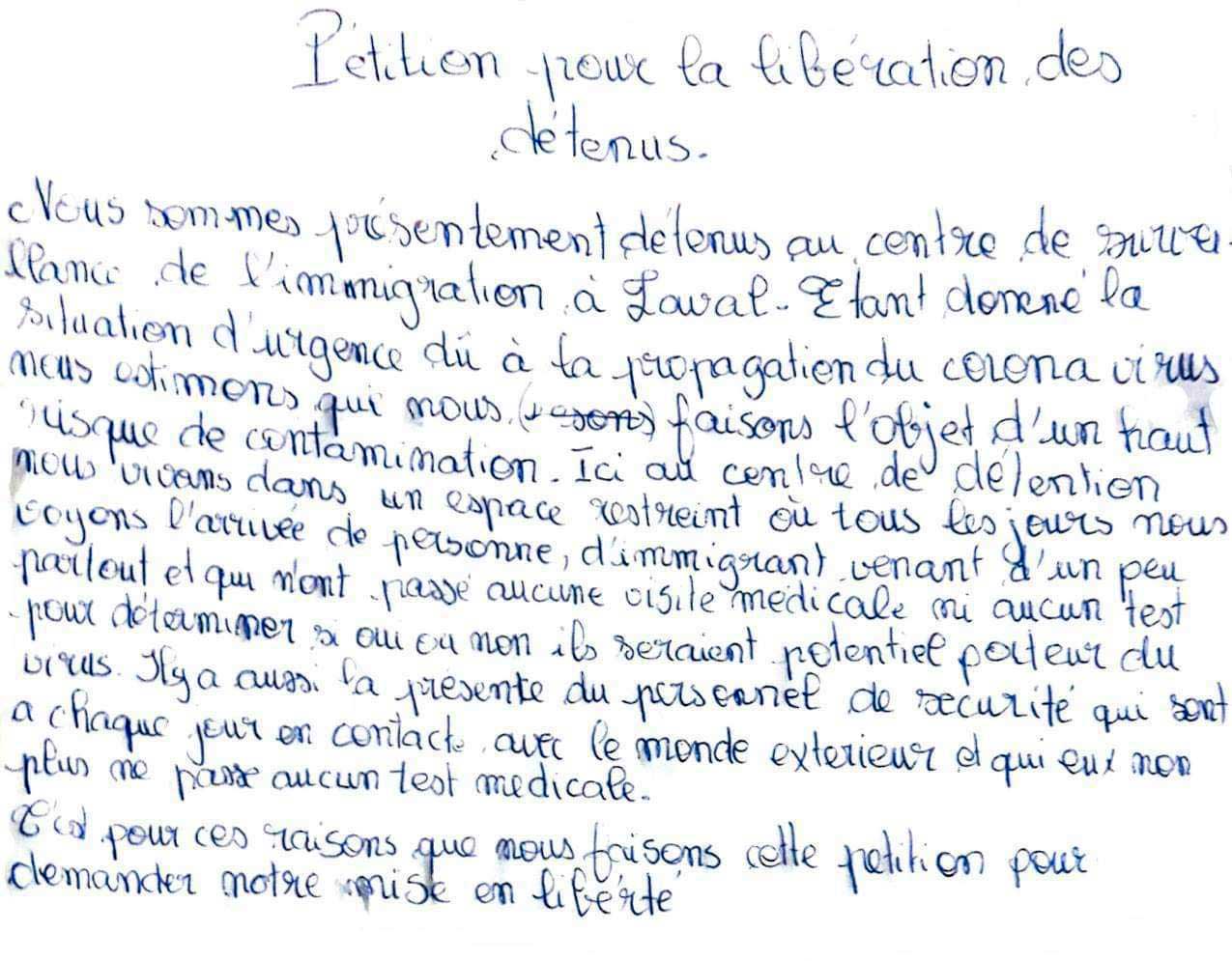 From March 24 to April 2, detainees at the Laval Migrant Detention Centre took part in a hunger strike demanding their release, citing the threat posed to incarcerated groups by the COVID-19 pandemic. As of April 4, some detainees had been released, but 20 remained in the facility due to the requirement of individual detention hearings before release.