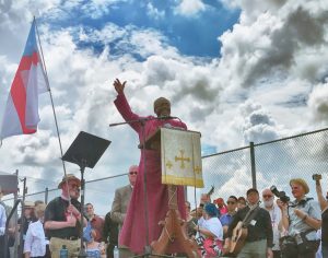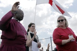 “We do not come in hatred, we do not come in bigotry, we do not come to put anybody down, we come to lift everybody up. We come in love, we come in love because we follow Jesus and Jesus taught us love,” said Presiding Bishop Michael Curry, in his sermon during the noontime Prayer of Vision, Witness and Justice held in sight of the Hutto Detention Facility here.
