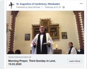 In Germany, even before the government banned religious services and other gatherings, the Anglican/Episcopal Church of St. Augustine of Canterbury in Wiesbaden suspended services on March 15. It was following the guidelines of the Old Catholic Church and some Protestant regions and Catholic dioceses. The Sunday service is broadcast on Facebook, YouTube and the church’s website; other weekday services and Bible study are available through Zoom.