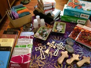 Then, they celebrate the Eucharist. Calabrigo closes with another poem, and they disperse, stopping on the way by a table laden with “comfort items” to be taken, as reminders, for the week ahead—small hearts, crosses, chocolate and tea.