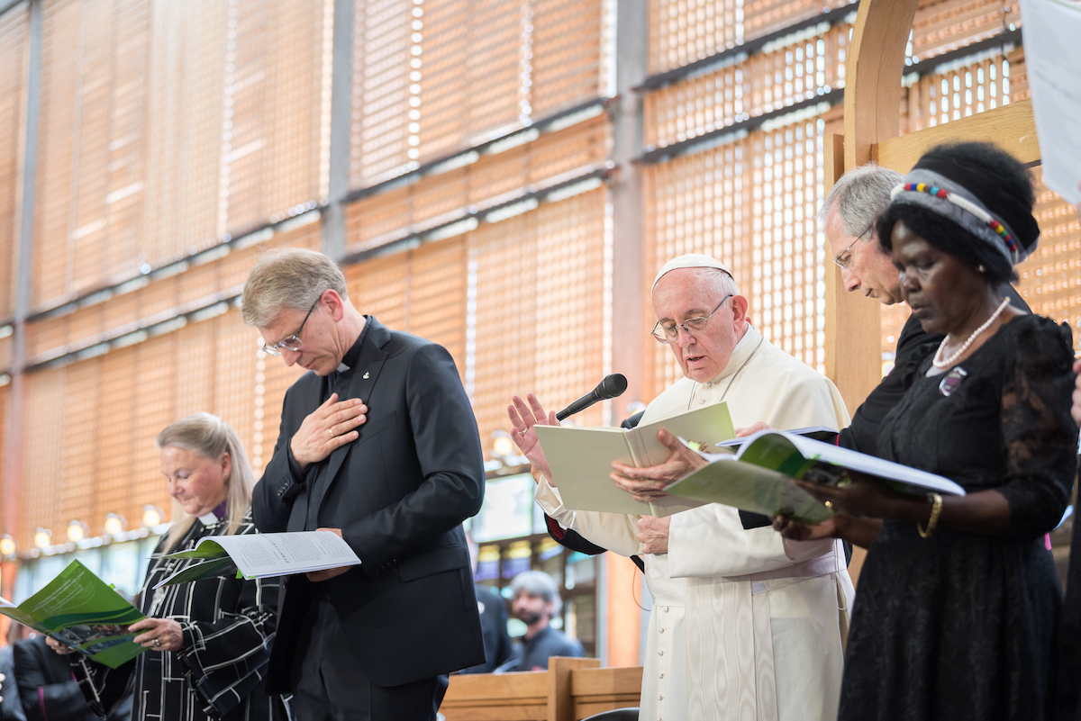 Pope Francis gives blessing at an ecumenical service June 21 with the leadership of the World Council of Churches. Photo: Albin Hillert/WCC