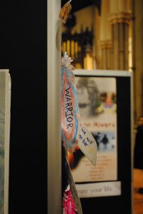 A mobile created from hundreds of paper feathers, cascading from a hoop bearing the colours of the medicine wheel, sits at the centre of the cathedral. The feathers were collected from schools and youth organizations as part of an outreach initiative—the 1,200 feathers sent out represent the 1,200 Indigenous women, girls, transgender and two-spirit people who have been classified as murdered or missing in Canada since 1980.