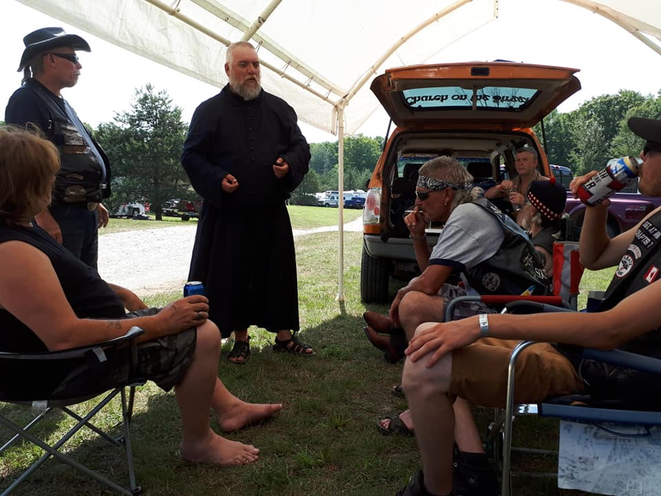 Church on the Street is open to everybody, but does much of its of work with bikers, partly because of Martin’s many links with the Ontario motorcyclist community. He has been involved with ministry of one kind or another to bikers for two decades, serving—among other roles—as official chaplain to the Ontario chapter of the Association of Bikers for Awareness, Training and Education (ABATE), a group for motorcycle enthusiasts, for 18 years until his retirement this year. He worked hard over those years, Martin says, to overcome the bikers’ distrust of religious authority, setting up coffee, water and first aid stations at motorcycle rallies, focusing on building up relationships. Eventually, some club members started asking for blessings and services.