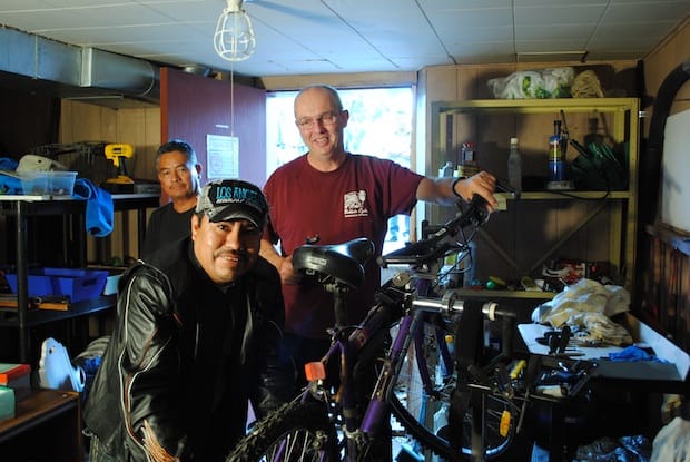 By the door to the church basement, Hahn and a couple of young Mexican men, speaking to each other in a patchwork of English and Spanish, are tinkering with a bicycle. Arias smiles.