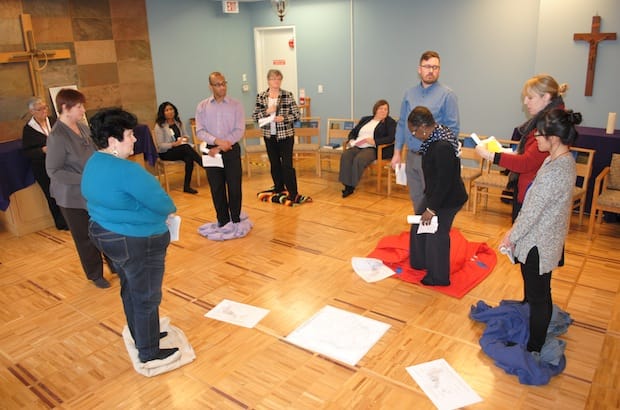 The chairs were pushed to the side, and in their place a half-dozen blankets lay spread on the floor. On these blankets some 15 people-General Synod employees and a few invited guests-paced or stood while two organizers read aloud about the historical plight of Indigenous people in Canada.