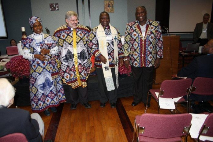 Bishop Barry Clarke of Montreal, with Masasi diocesan partners Bishop Patrick Mwachiko and Geofrey Monjesa. At left, Emericiana Mwachiko, wife of Bishop Patrick, is president of the diocesan Mothers' Union. Photo: Harvey Shepherd