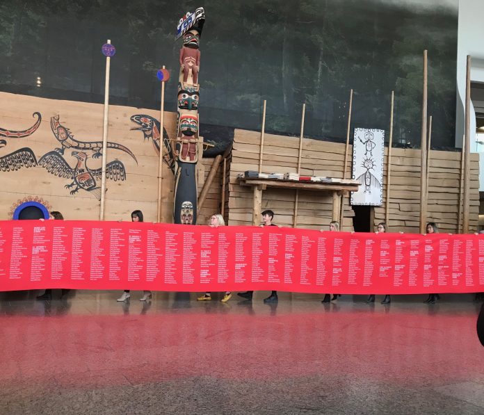 The names of 2,800 children known to have died in the schools were printed in white on a 50-metre-long red cloth solemnly carried by a procession of volunteers through the museum’s Grand Hall and up onto the stage. Its length served as a reminder of the magnitude of loss and grief felt by Indigenous families and communities across Canada—though the red cloth only bore a partial list of the children who died while attending the schools.