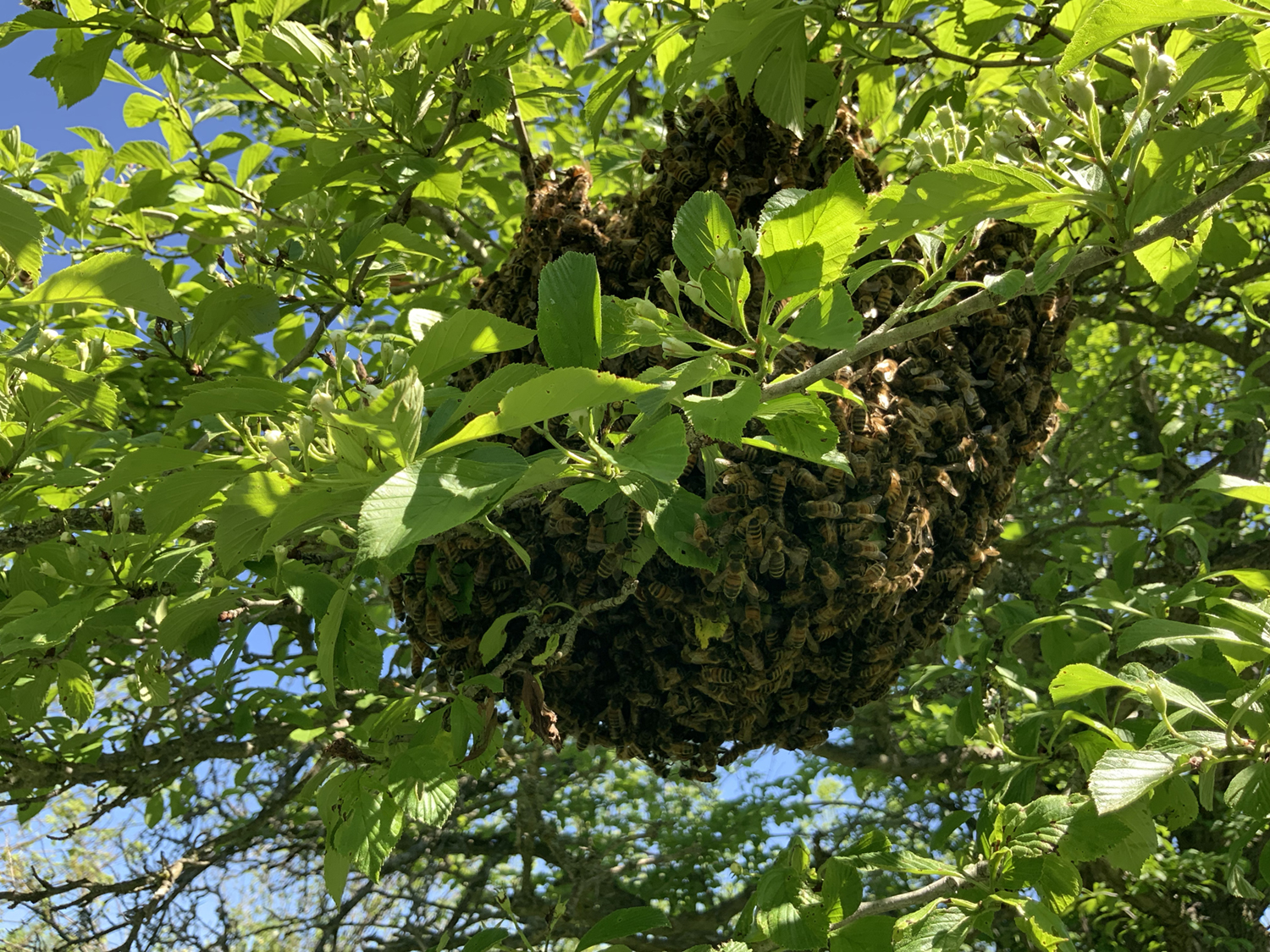 Swarming happens typically in the spring, when a colony runs out of space or hatches new queen bees. Then the old queen and a large group of worker bees leave the hive to start a new one.