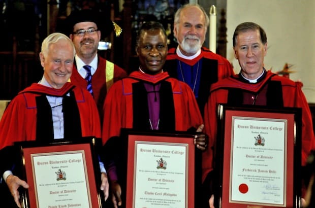London, Ont.’s Huron University College presented three honorary degrees to three distinguished people at its theology convocation on May 9. Governor General David Johnston received a doctor of divinity degree, while Archbishop Thabo Makgabo, primate of the Anglican Church of Southern Africa, and Archbishop Fred Hiltz, primate of the Anglican Church of Canada, both received honorary doctorate degrees.