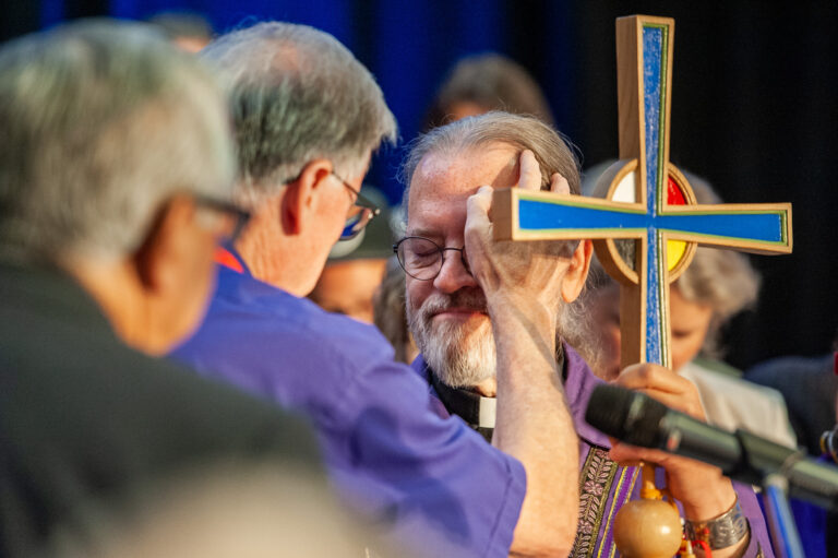 Immediately after the results of the votes were announced—and a standing ovation from members of General Synod had subsided—primate of the Anglican Church of Canada Archbishop Fred Hiltz called all Indigenous members and partners of General Synod to the stage to witness MacDonald being installed as an Archbishop.