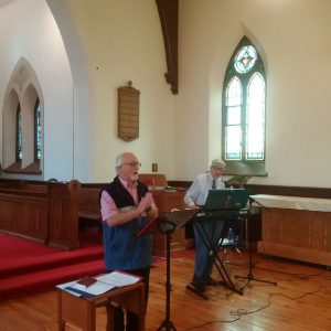 Every Friday afternoon, about a dozen people—dementia-sufferers and their caregivers—gather at the church for a hot lunch, followed by an hour or less of hymns and other music, prayers, short conversations and Bible stories. Most of the services are led by Tom McCormick, a non-denominational chaplain at a local long-term care home; the Rev. Matt McMillan, parish priest at St. Mary’s, often assists and sometimes leads; and Ron Wilson, an occasional lay minister at a Presbyterian church, handles the music.