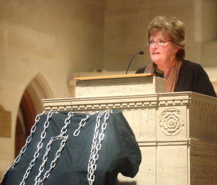 All of the justice groups’ representatives spoke from a podium behind a display of silver-coloured chains, symbolizing bondage. The congregation responded after each of the prayers.