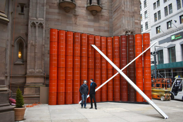 Trinity, which Rosen called “sort of the radiating center” of the exhibition, was chose for the 13th station, “Jesus Is Taken Down From the Cross.” Just outside the church, next to its renowned cemetery, stand 14 tall columns of stacked oil barrels. The red columns are intersected by two steel beams that, when viewed from a certain angle, form a large cross. The artwork, titled “Stations,” was created by G. Roland Biermann, who painted the barrels in 14 different shades of red, signifying the colour of blood.