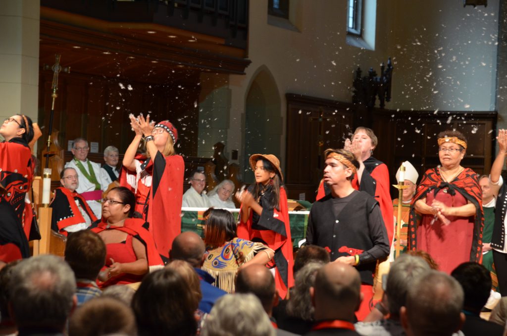 The beginning of the worship service included a land acknowledgement noting that the 42nd General Synod took place on the ancestral and unceded lands of the Musqueam, Squamish and Tsleil-Waututh nations. Opening music and drumming by the Kwhlii Gibaygum Nisga’a Dancers featured songs of peace and welcome. A hymn played during communion, “I Have Called You By Name,” reflected the theme of the General Synod and was composed to honor the primacy of Hiltz.