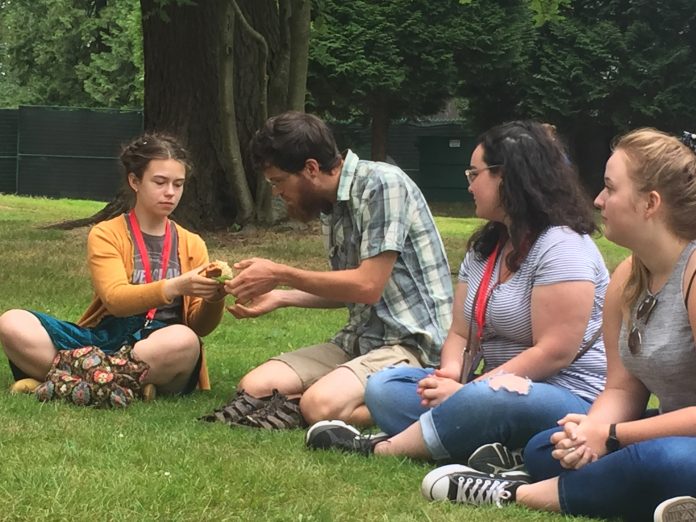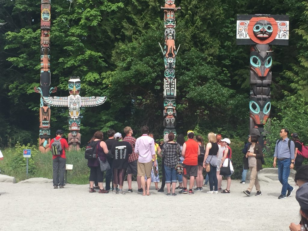 In the afternoon, the youth visited Stanley Park, where they celebrated the Eucharist and took part in the Spoken Treasures tour, led by Indigenous company Talaysay Tours. The tour ended at totem poles, where their guides told them stories about the history of the land from Indigenous perspectives.